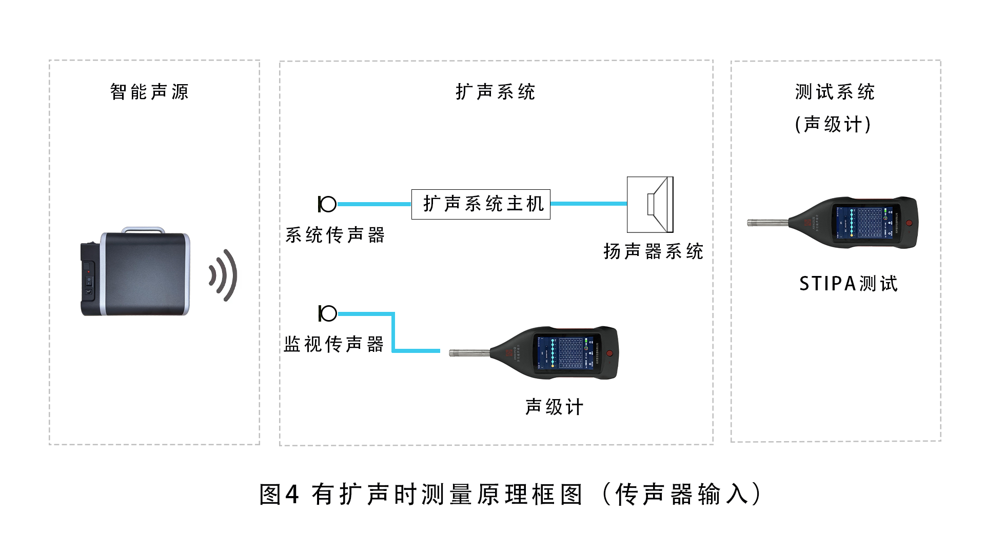 对于那些需要使用扩声传声器讲话或播音,再通过扩声系统播放的场所,测试信号由智能声源对着系统传声器发声。测试声源应置于正常说话距离,传声器的轴线指向正常发话方向;测试信号级与正常说话声压级相当,在距离声源0.5 m处声压级为66 dBA。在传声器输入处可用声级计监测该声压级以及测试信号频谱。测试声信号经扩声系统由扬声器系统播放,利用声级计可以按相关标准要求测量扩声系统和声学场所的各项指标。