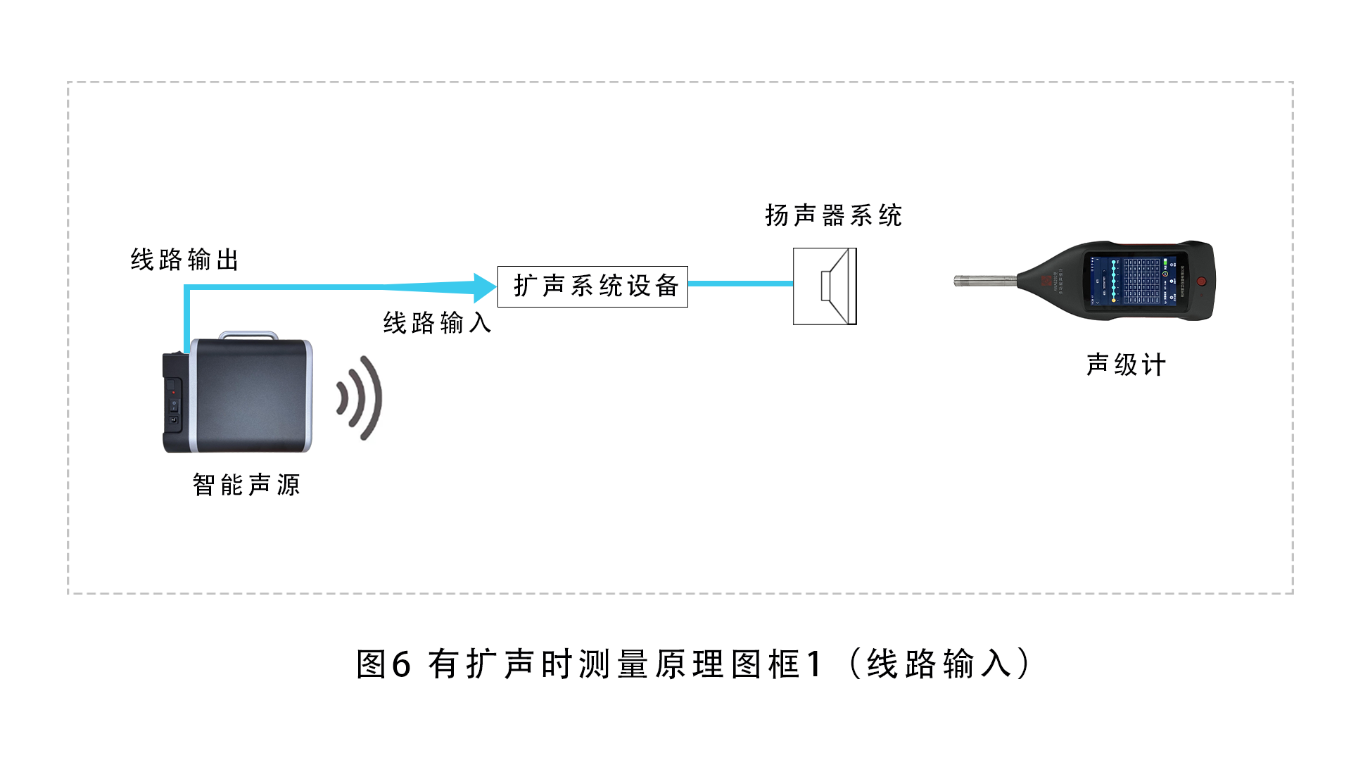 如果被测场所内扩声系统不含系统传声器而是直接通过播放器播放音频,则将智能音箱中线路输出的电信号输入至扩声系统的线路输入。测试信号通过扩声调音台线路输入扩声系统,经扩声系统使扬声器系统发声,由声级计按相关标准要求测量扩声系统和声学场所的各项指标。